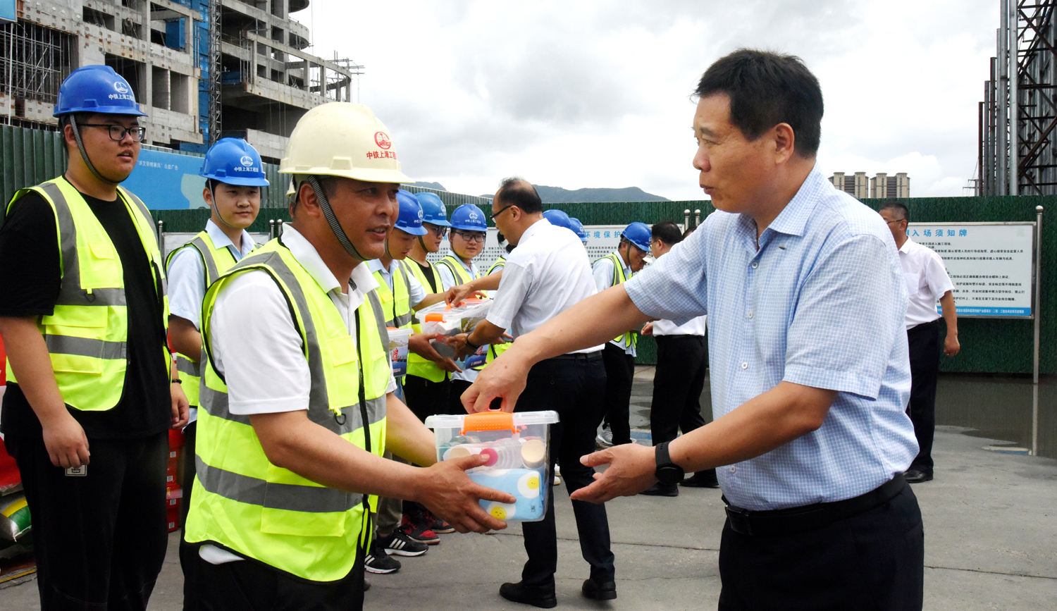 在集團公司國際醫藥創新產業園二期項目工地,丁維杰與職工們親切交談,詳細了解生產生活情況,向頂高溫、冒酷暑,堅守在崗位的工程項目建設者們致以崇高的敬意和親切的問候,希望他們在堅守崗位的同時,增強自我保護意識,做好防暑降溫工作。同時督促建設單位要貫徹落實防暑降溫政策措施,增設防暑降溫設施,保障項目建設一線勞動者的人身安全和身體健康。