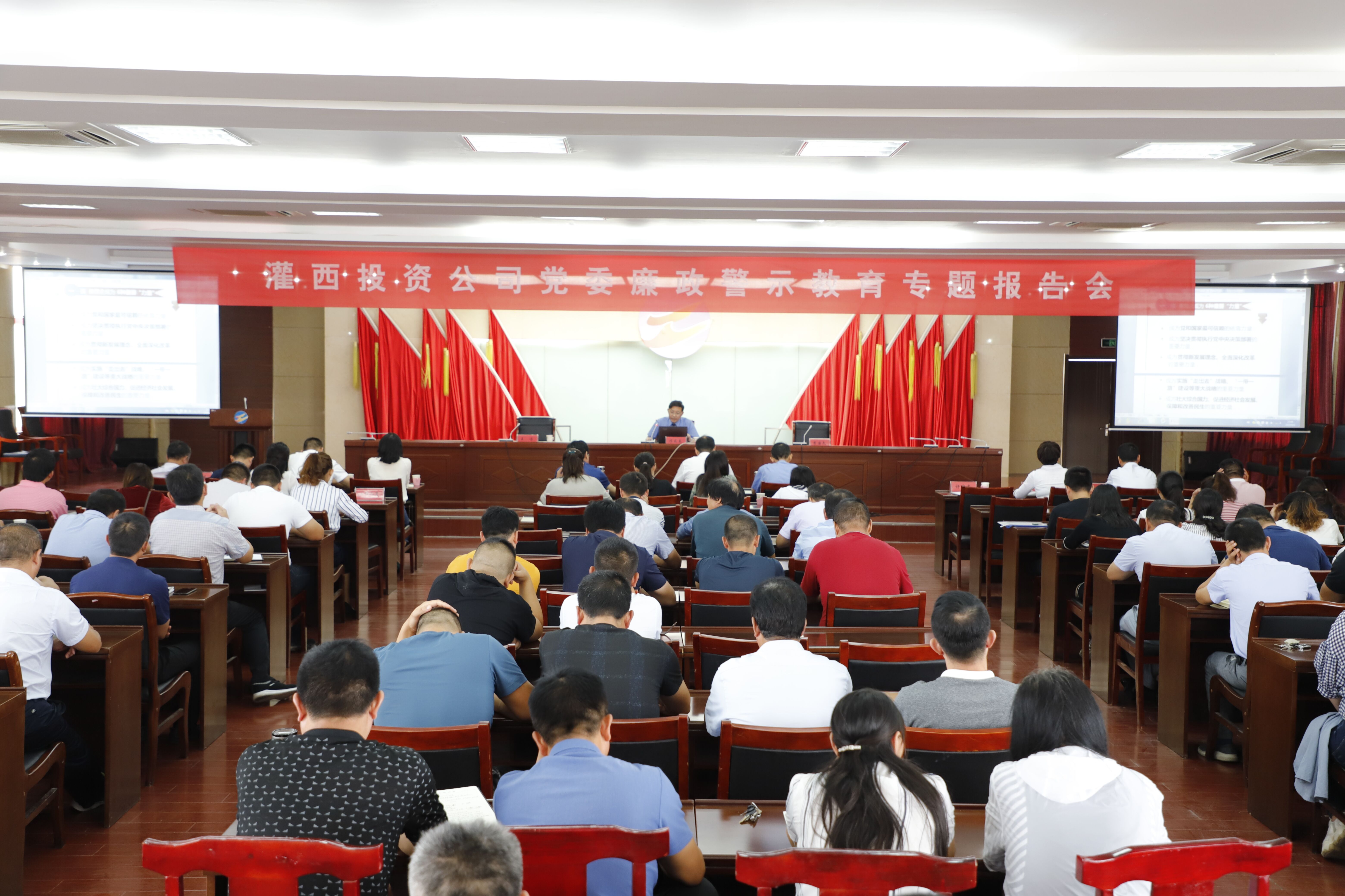 9月6 日,灌西投資公司舉辦廉政警示教育專題報告會,邀請灌云縣檢察院檢察長陳長春、檢察院黨組成員王浩進企業作報告。