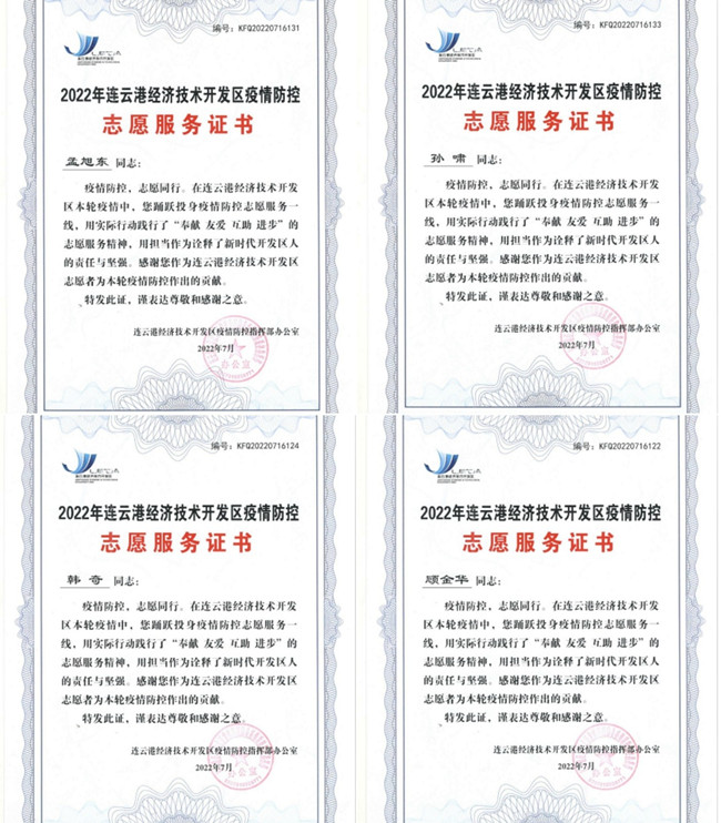 近日,連云港經濟技術開發區領導來到公司,對氨綸公司積極參與疫情防控工作表示感謝,并向公司志愿者頒發了疫情防控榮譽證書,感謝他們在疫情防控中所作出的積極貢獻。