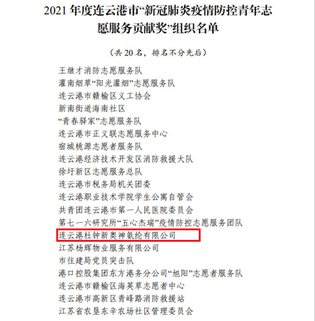 近日,共青團連云港市委員會公布2021年度全市青年志愿者行動暨新冠肺炎疫情防控青年志愿服務貢獻獎評選表彰結果,連云港杜鐘新奧神氨綸有限公司志愿者服務隊榜上有名,榮獲2021年度連云港市“新冠肺炎疫情防控青年志愿服務貢獻獎”組織榮譽稱號。