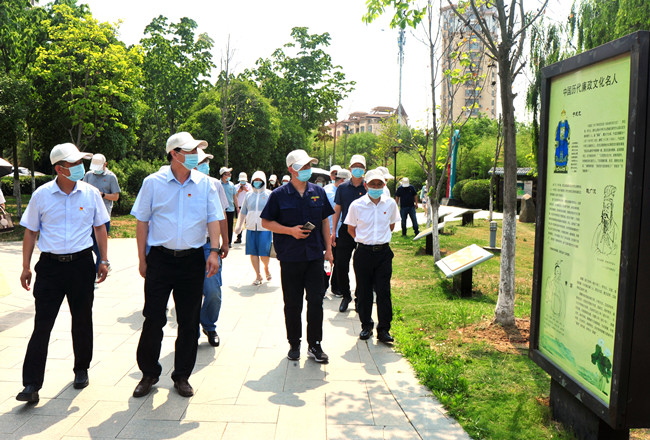 金石園內,眾人瀏覽了中國歷代廉政文化名人的事跡介紹。懷清廊中,大家認真閱讀了緬懷朱自清先生的四副對聯。來到清氣堂,一行人在解說員的介紹下,深入了解朱自清的生平歷程,包括“出生東海”“成長揚州”“投身五四”等九個部分。看著背景形象墻上雕刻著的毛澤東親筆題寫的“我們中國人是有骨氣的。朱自清一身重病,寧可餓死,不領美國的救濟糧”,朱自清先生追求民主、崇尚大義的民族氣節使在場人員深受感動。