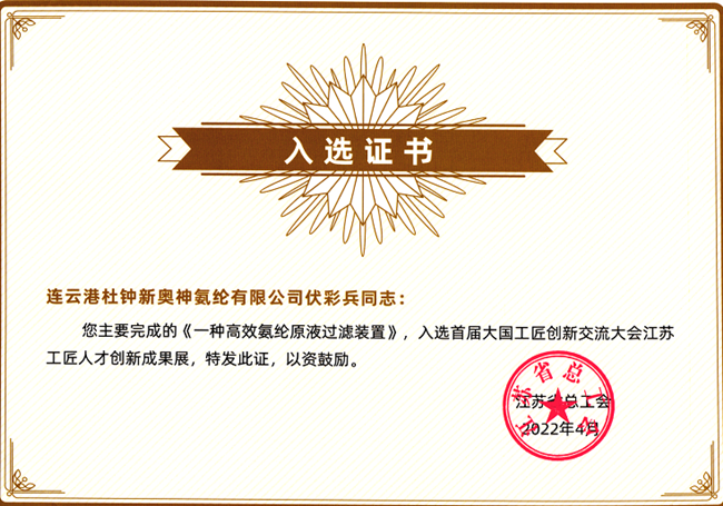 根據省、市總工會部署要求,氨綸公司積極組織工匠人才參展。經評選,公司伏彩兵主要完成的《一種高效氨綸原液過濾裝置》創新成果入選大國工匠展,伏彩兵還入選了首屆大國工匠創新交流大會江蘇展區重點展示科創推薦通道。