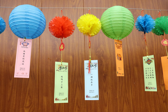 燈謎活動(dòng)現(xiàn)場(chǎng),燈籠和彩旗下懸掛著五顏六色百余個(gè)謎面,洋溢著濃濃的節(jié)日氣氛。燈謎內(nèi)容涉及冬奧會(huì)、傳統(tǒng)知識(shí)、生活常識(shí)、歇后語(yǔ)等方面,既具趣味性,又具知識(shí)性。