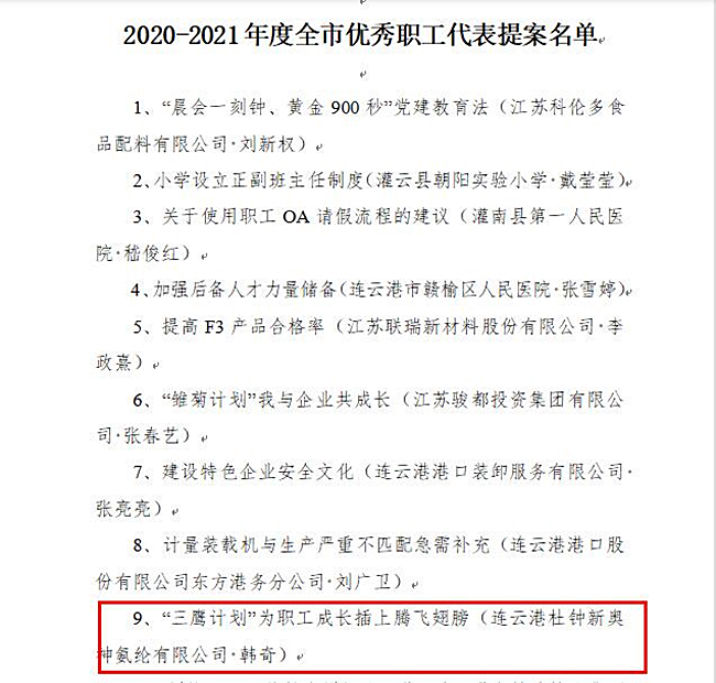 日前,市總工會開展全市優秀職工代表提案征集推薦活動評選結果正式公布,杜鐘氨綸公司《“三鷹計劃”為職工成長插上騰飛翅膀》榮獲全市優秀職工代表提案。