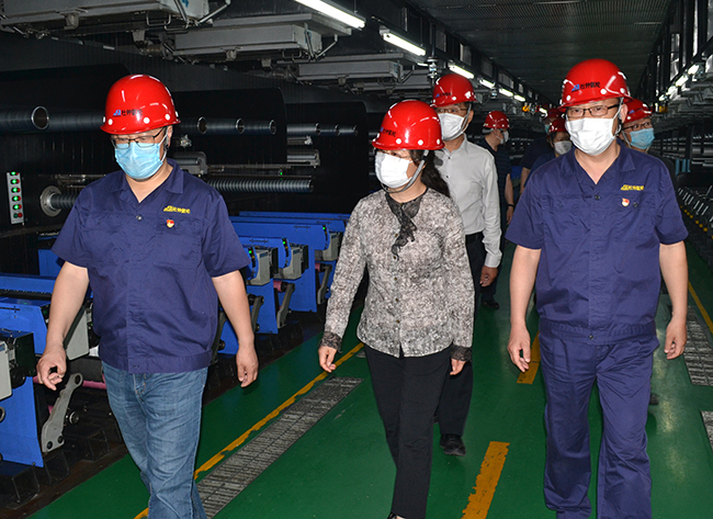 秦云副主席一行先后參觀了公司展廳、黨員活動室、八期生產線、自動化包裝線以及自動化立體庫。參觀過程中,趙書記詳細介紹了公司發展歷程、差別化產品性能特點以及公司今年以來在應對疫情中工會開展的各項工作等。秦云副主席對我公司工會圍繞中心工作一手抓防疫一手抓生產發揮的突出作用表示肯定。對公司開展的三鷹計劃實施、和諧班組建設、員工權益保障、三進三融助生產等方面的工作稱贊有加。