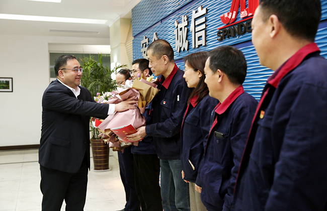 楊董事長進基層、到一線,與勞模先進面對面交流,傾聽他們的心聲和意見,感謝他們長期以來為企業發展作出的貢獻,并獻上一束鮮花、送上一封慰問信、發放一張蛋糕卡、特制一張健康卡、送上一份祝福。