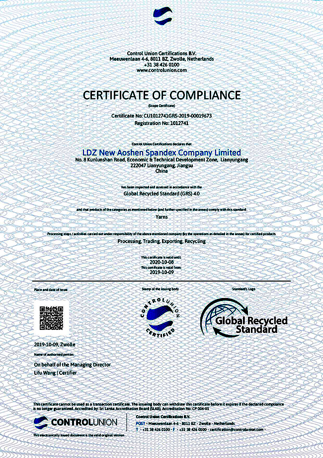 2019年10月9日,連云港杜鐘新奧神氨綸有限公司通過全球回收標準認證,取得GRS證書,即獲得對再生氨綸纖維生產的資質,可根據客戶需要提供貿易證書(TC)和全球認可的GRS吊牌。
