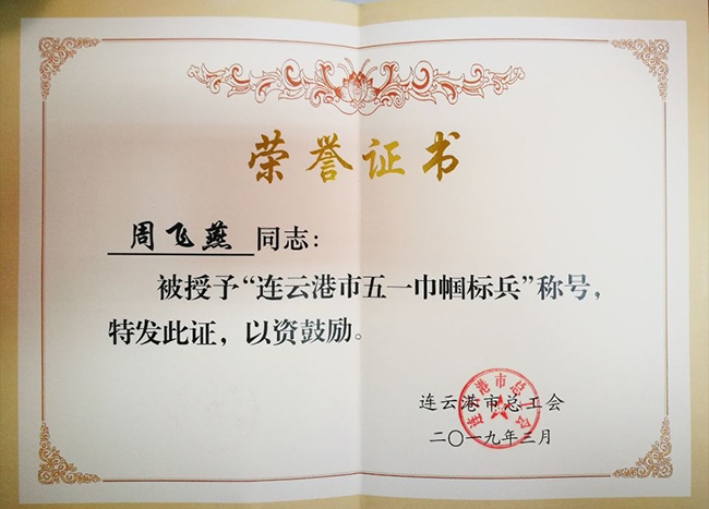 熱烈祝賀我公司市場(chǎng)開(kāi)發(fā)部周飛燕同志被連云港市總工會(huì)授予“連云港市五一巾幗標(biāo)兵”榮譽(yù)稱(chēng)號(hào)。 氨綸宣 2019年3月11日