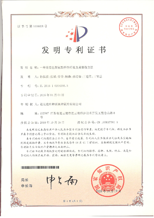 近日,從國家知識產權局傳來喜訊,連云港杜鐘新奧神氨綸有限公司申報的“一種易著色聚氨酯彈性纖維及其制備方法”專利獲得國家發明專利授權。