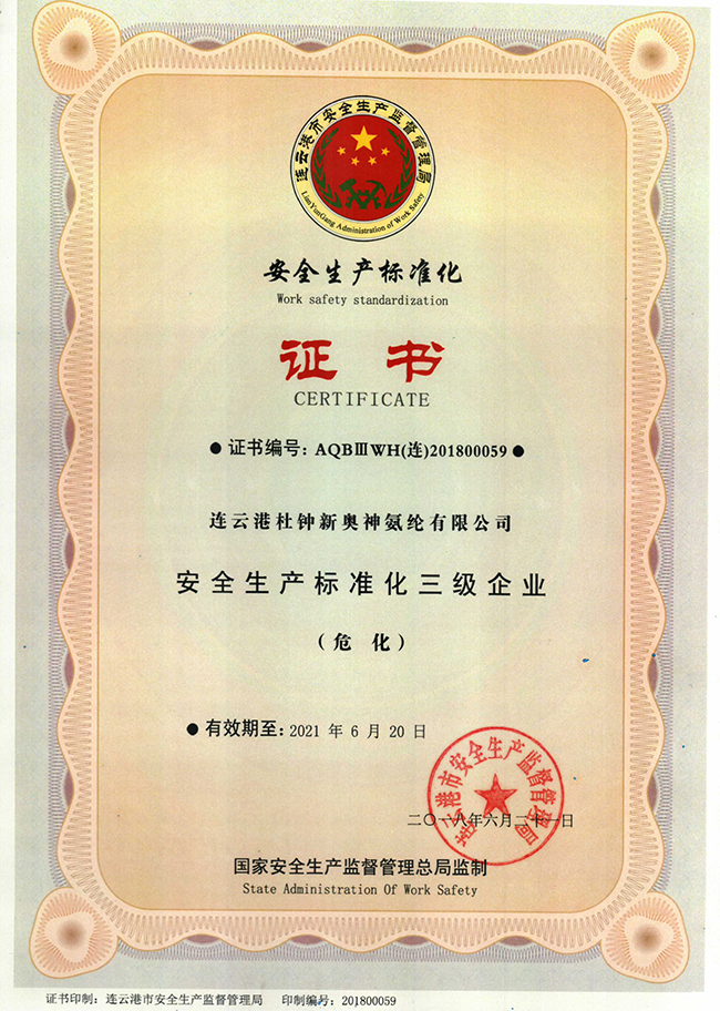 經企業自評、縣區安監局初審、市安監局形式審查、考評機構考評、市局抽查頒證等程序,最終氨綸公司順利通過評審,取得了安全生產標準化三級企業(危化)證書。