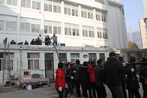 公司承擔集團公司ERP項目機房電纜工程,工期較緊。該工程電纜系低壓五芯電力電纜(240*3+120*2),總長230米,重近3噸。施工現場又處于金橋新村小區內,全靠人力施工,需要施工人員較多;而公司工程部和供電所工作人員大都正在忙于其它電力工程,能抽調的人員非常有限。為不誤工期,轉變工作作風,公司在領導班子親自帶隊,機關工作人員全體出動,齊心協力,拖、拉、拽、送,敷設電纜上墻,并吊送到位于五樓的ERP項目機房。