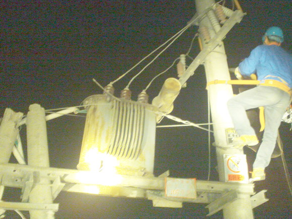 徐圩供電所立即派搶修人員趕到現場。海通攪拌站廠區事故現場,高壓桿傾斜,低壓桿折斷,變壓器高低壓樁頭全部歪曲,損壞嚴重,夜間無法修復。為盡快使其它線路恢復供電,搶修人員黑夜進行應急處理,折除了變壓器高壓引線,并作了妥善的安全保障。同時,加緊準備搶修材料、電桿及變電設備。