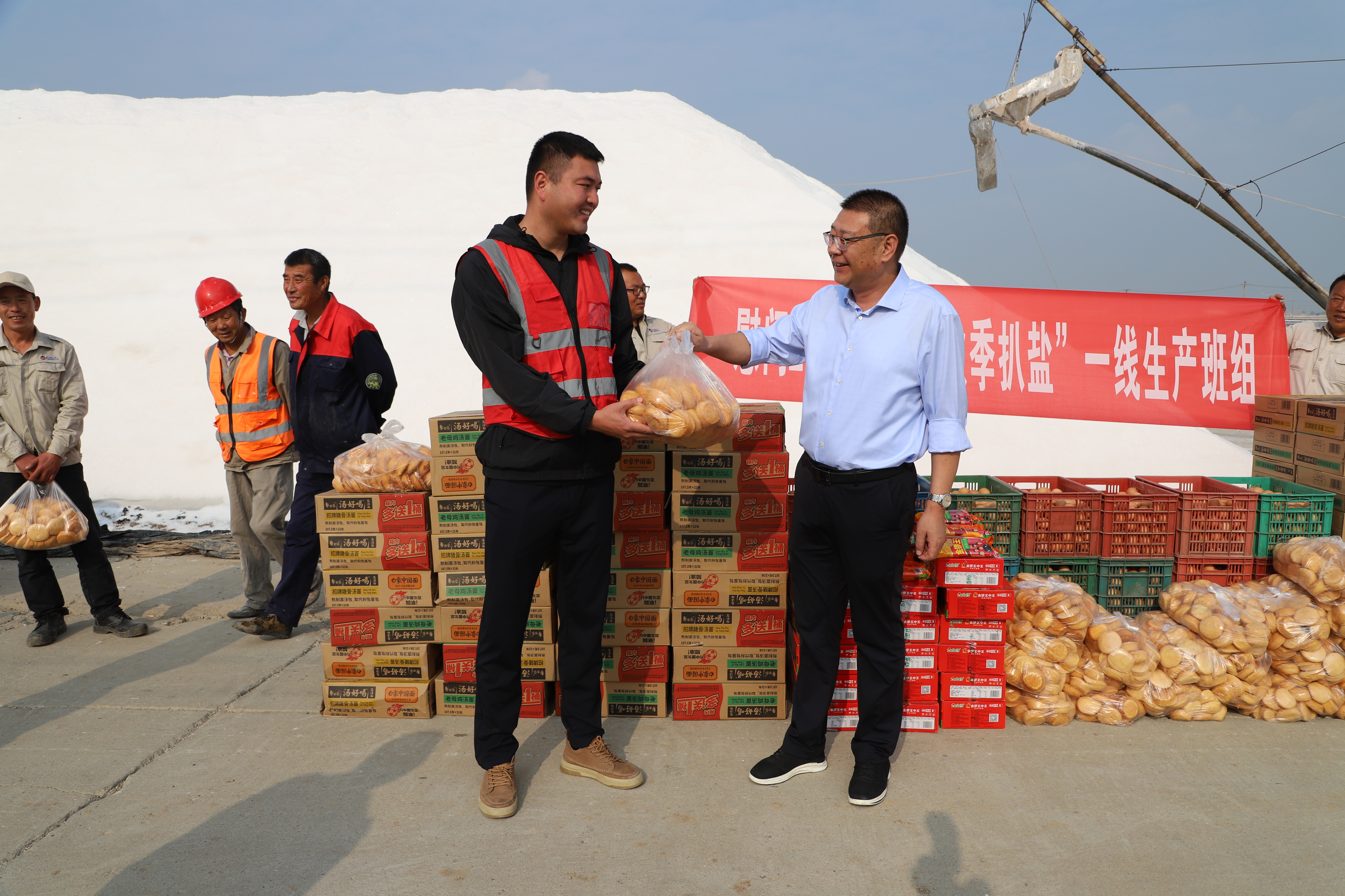 “你們辛苦了,我代表公司來看望大家。”在新河五班,孫政權與扒鹽現場職工握手問好,感謝他們?yōu)槿諘裰汽}公司的原鹽生產所付出的辛勤努力,叮囑他們要落實落細扒鹽安全生產措施,并送上雞蛋、方便面、火腿腸、雞蛋糕等物品。