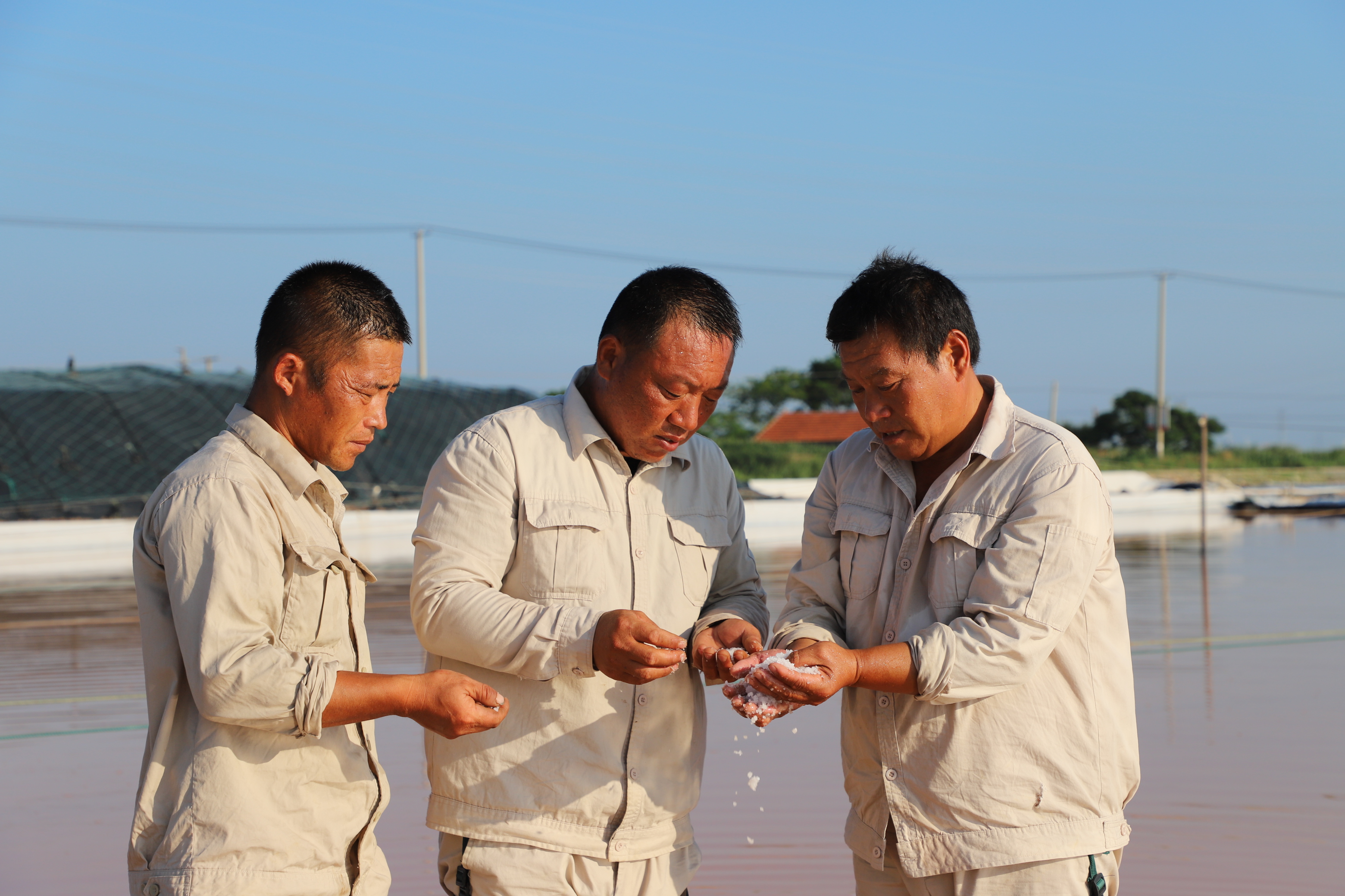 “氣溫越高,鹽的蒸發量就越高,公司效益就好,按今年的產鹽趨勢,超額完成公司指標任務應該不成問題,我們工人心里也高興呀!”勞模祝星星擦著臉上的汗珠自豪的說道?!扒缣煲簧砗梗晏煲簧砟唷笔侵汽}人的家常便飯,為確保汛期安全生產,避開高溫時段作業,凌晨五點鐘,工人們已忙著鹵水除硫、維護收拉塑布收房系統、修補塑布……。鹽工身上的汗水與鹵水交織在一起,浸濕了工作服,透過驕陽他們黝黑的臉龐顯得越發的锃亮。