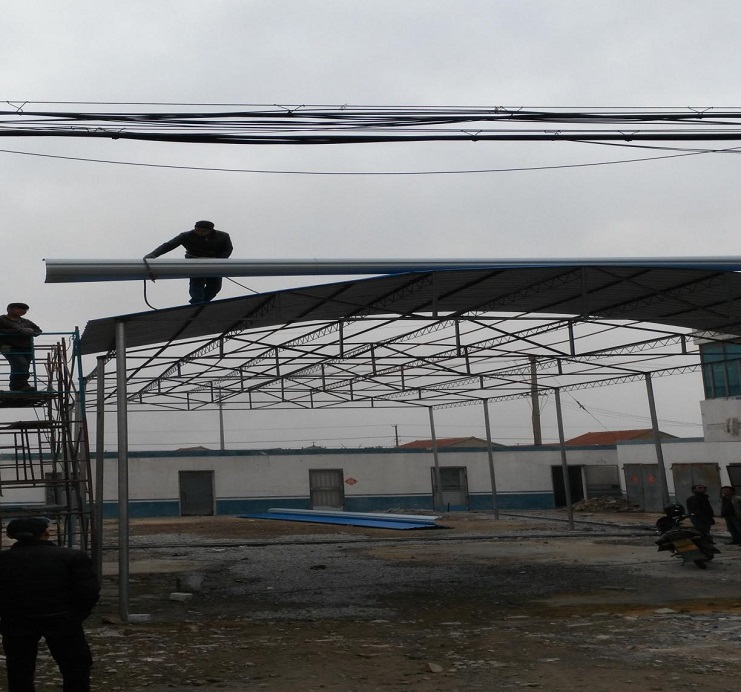 自4月初承接我場中二圩愛心市場大棚制作任務后,機電服務公司班子認真進行研究制作方案,購買優質材料,合理安排技術人員進行制作,做到多頭并進,加班加點,勞模王緒華、星級員工程洪連身先士卒,其他員工積極參與,到4月19日,全面、安全完成制作安裝任務。(圖為現場施工中)(胡亞東)