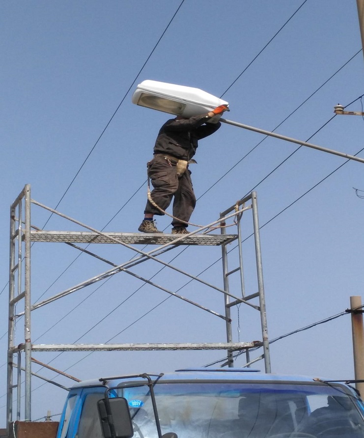為保證日曬鹽公司職工夜間上班安全,機電服務公司接到任務后,及時組織技術人員對道路路燈進行檢查,確定修理方案, 該公司職工能放棄休息日,進行搶修。共更換引線10盞,換燈泡20只。(圖為5月7上午開始修理現場)