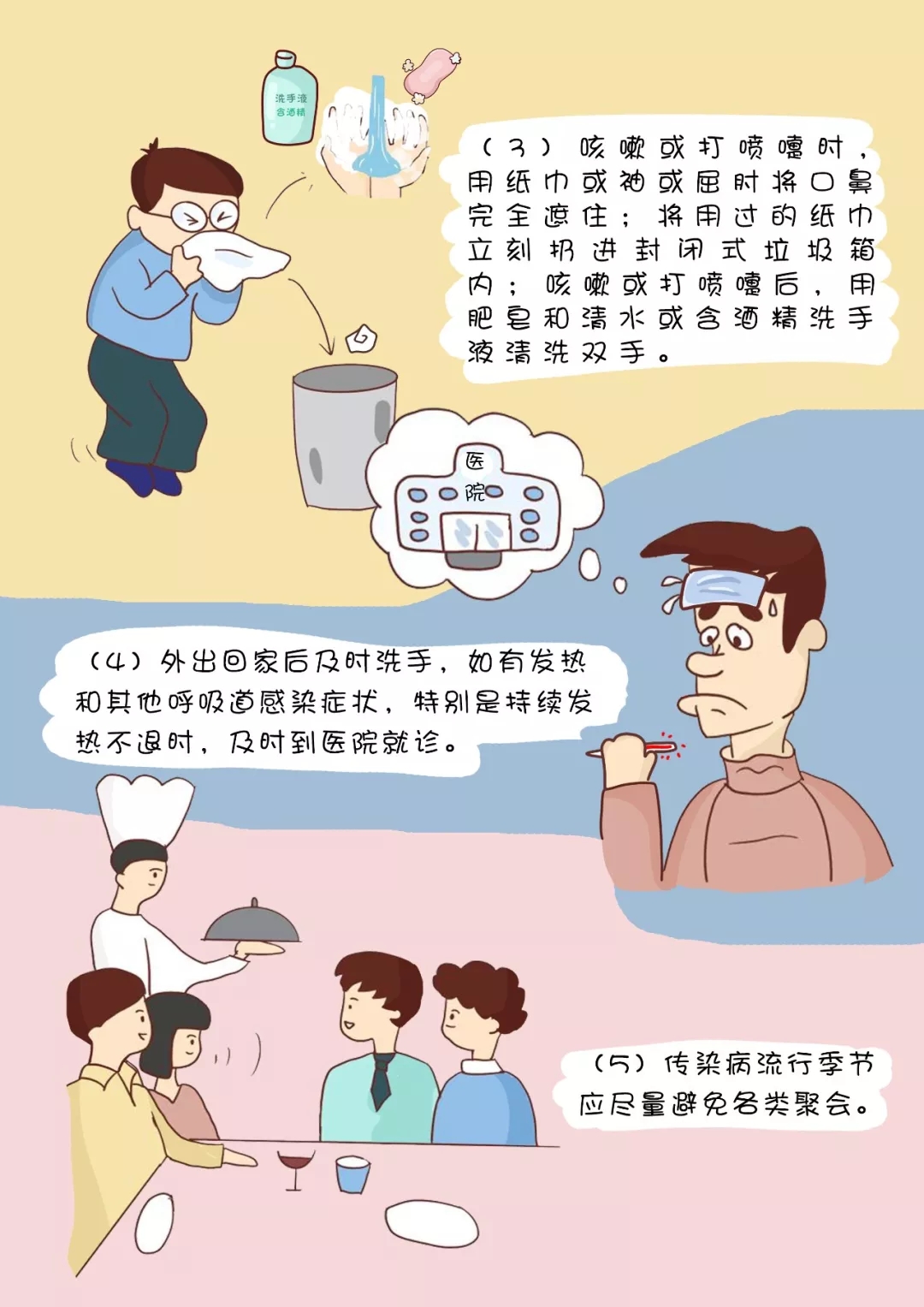 (3)咳嗽或打噴嚏時,用紙巾或袖或屈肘將口鼻完全遮住;將用過的紙巾立刻扔進(jìn)封閉式垃圾箱內(nèi);咳嗽或打噴嚏后,用肥皂和清水或含酒精洗手液清洗雙手。