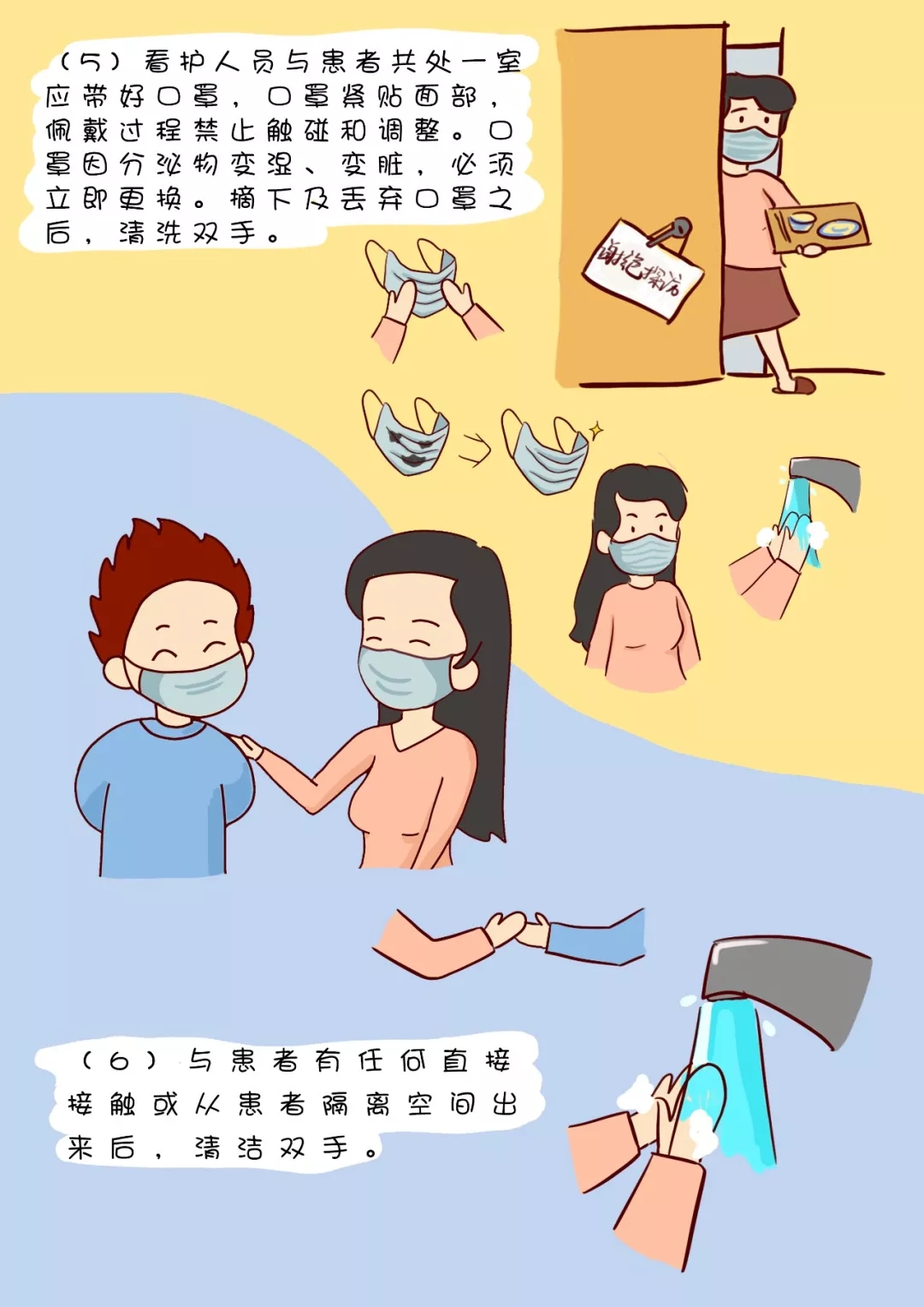 (5)看護(hù)人員與患者共處一室應(yīng)帶好口罩,口罩緊貼面部,佩戴過程禁止觸碰和調(diào)整。口罩因分泌物變濕、變臟,必須立即更換。摘下及丟棄口罩之后,清洗雙手。