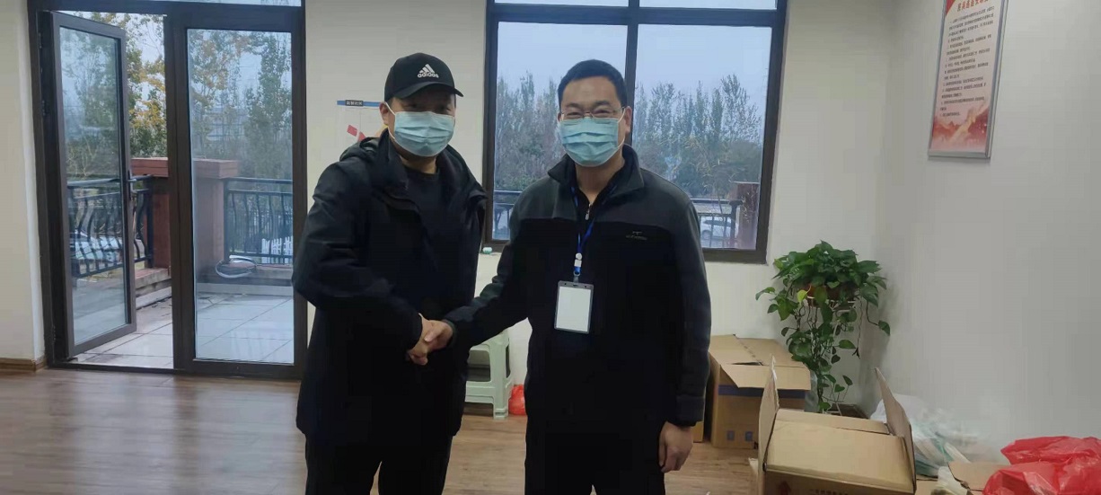 連云港市新浦街道新橋社區黨委書記史建國握著資產公司黨支部副書記王順友的手說“感謝工投志愿者為社區疫情阻擊戰所做的巨大貢獻”。