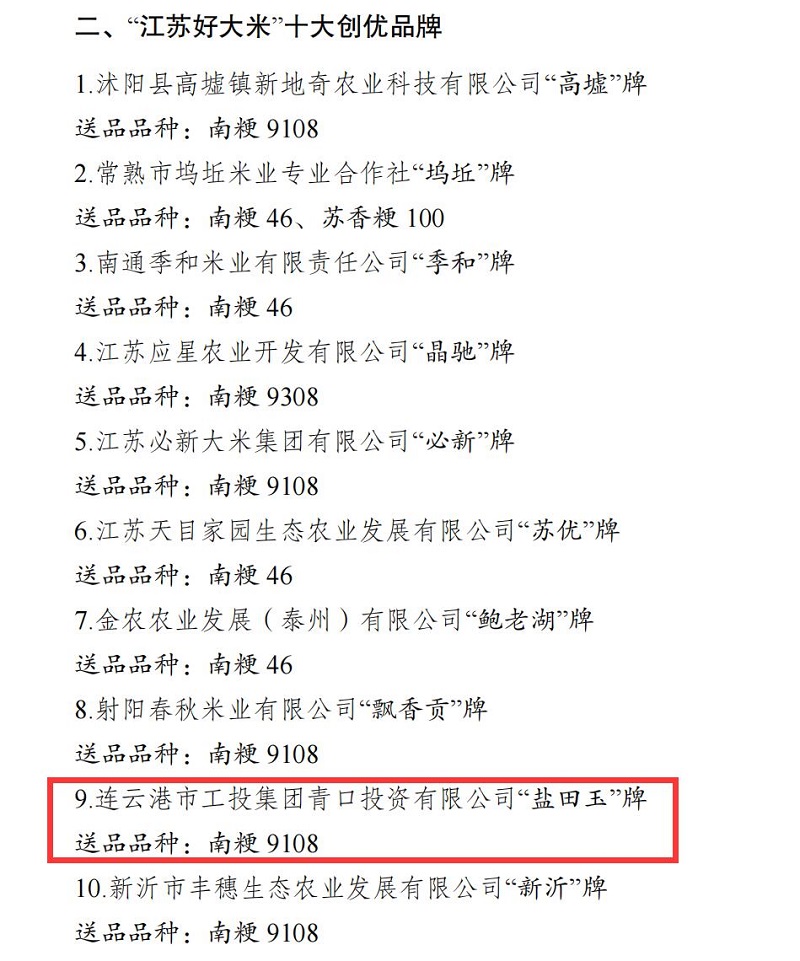 近日,第八屆江蘇好大米評鑒推介結果公布,“鹽田玉”品牌再創佳績,榮獲“江蘇好大米”十大創優品牌。