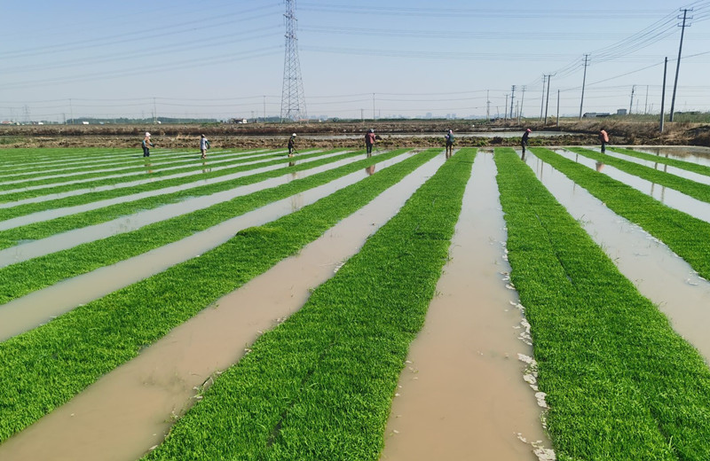 近日,大新農場自營農田機插秧苗已全部揭開無紡布,秧苗整體長勢較好,一片綠意盎然。目前播種較早的秧苗苗齡在三葉一心。(劉 楊)