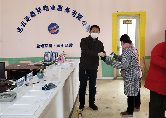 自新型冠狀病毒感染的肺炎疫情發生以來,泰祥公司所有的保潔、保安堅守崗位,兢兢業業,奮戰在疫情防控工作的第一線。為了確保他們的身體健康并感謝他們家人的理解,在消毒液緊缺的情況下,公司率先錯時為他們發放酒精和84消毒水,并及時告知使用酒精和84消毒水的注意事項。(趙萌萌)
