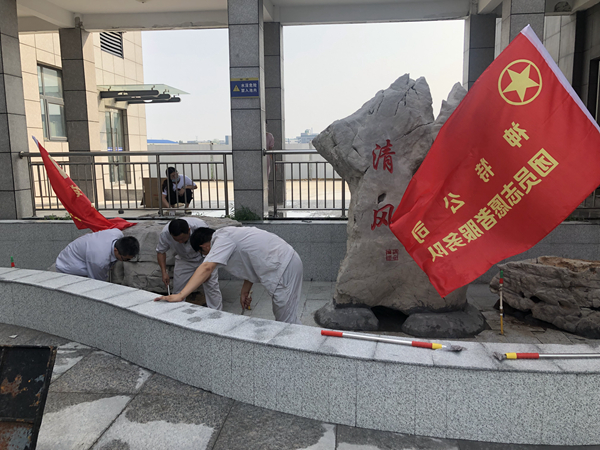 炎熱的天氣下,志愿者們不怕苦,不怕累,奮外賣力的清潔綜合辦公樓東側(cè)的廉政景觀池“清風(fēng)池”。大家齊心協(xié)力,不到一小時(shí)就把“清風(fēng)池”打掃得煥然一新。