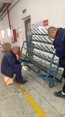維修臺車時,我當起了孫師傅的下手,一邊將臺車穩住不能傾倒,一邊看著孫師傅卸下每個車輪子并進行仔細清理,不怕臟、不怕累,毫無怨言一絲不茍,動作利落,手法嫻熟,親身直面他的高效率和專業水平。還對我詳細解說,讓我理解每個步驟的重要性和關鍵點。我們蔣姐也過來幫忙,不停的清掃臺車上清理出來的垃圾……