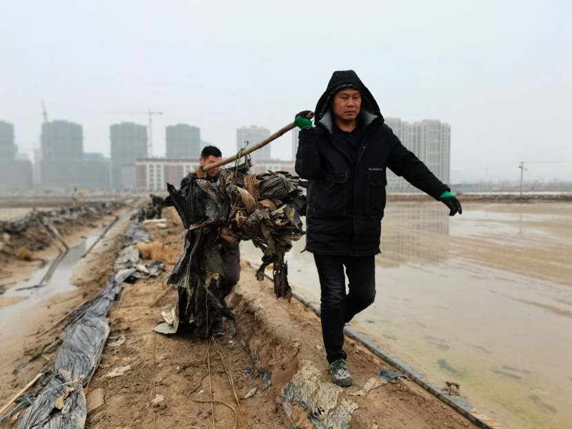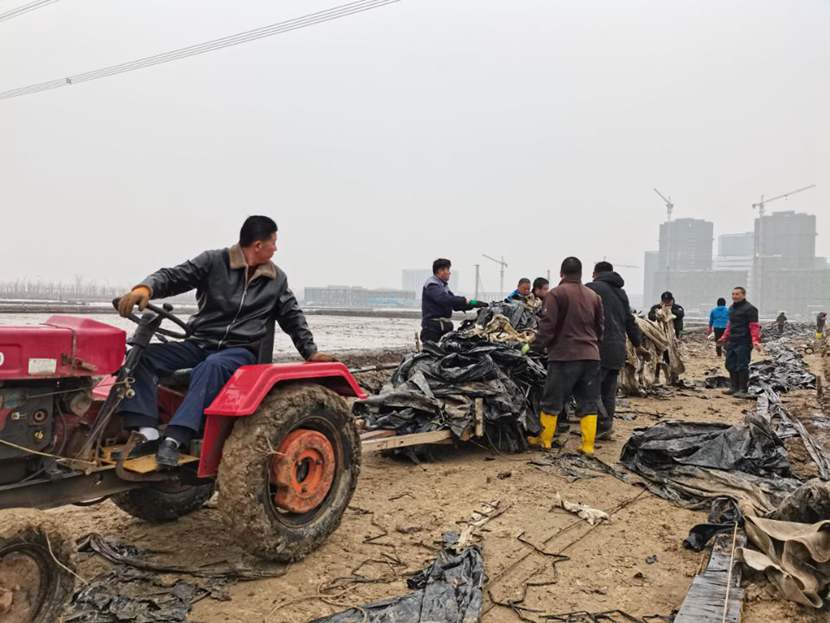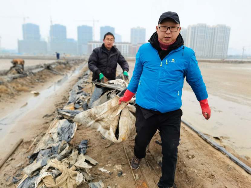 1月10日下午,第一批馳援隊伍——翔立分公司黨員突擊隊到達先鋒班組,結合海州灣公司黨員突擊隊共30余名隊員,穿戴好工作服、水鞋,兩人一組,三人一隊,雙肩挑,三人抬,緊張有序地清理生產現場拆除下來的廢棄的塑布、鋼絲等雜物。
