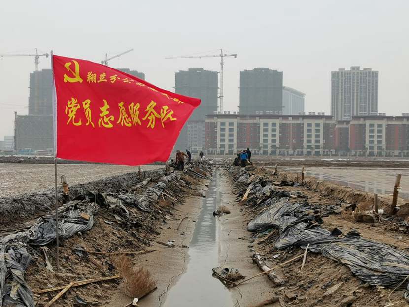 勞動現場,鮮紅的“黨員突擊隊”旗幟迎風飄揚,凜冽的寒風夾雜著細雨,絲毫不減大家的勞動熱情,個個汗流浹背、滿身泥漿,不怕臟不怕累,經過3個小時的突擊勞動,共清理1200米、16車池埝垃圾。