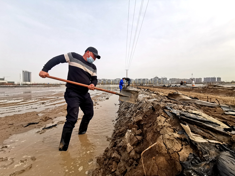 往東邊看,先鋒東灘黨旗招展分外鮮紅,海州灣公司18個單元職工、3名班組長全員出動馳援大浦工區協同重整410畝閑置鈣鹽灘地。引水入溝、翻泥上堰、腳踩和整、鐵掀蹋平,動作嫻熟。1200余米的10余條池堰僅用一天的就順利完工。