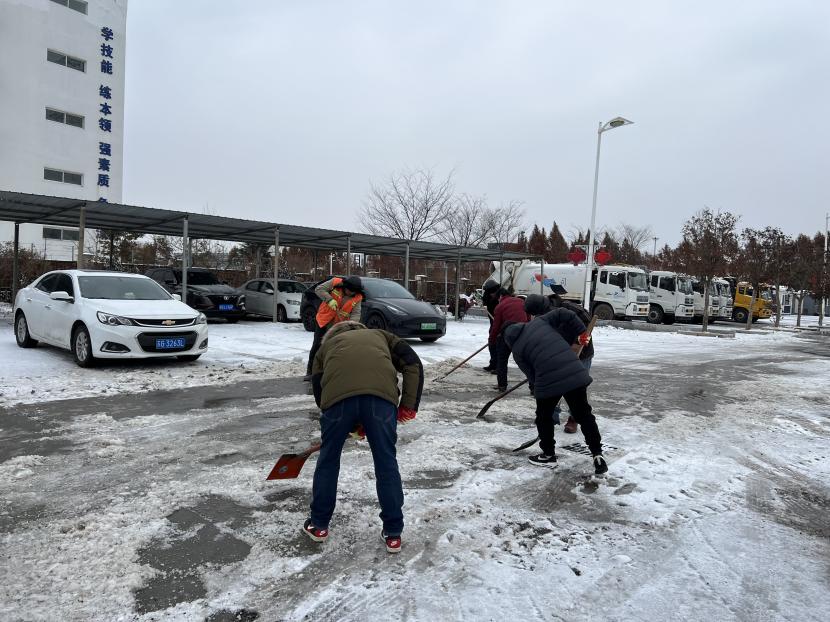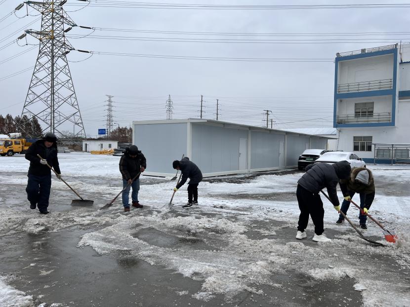 在清理工作現場,該公司負責人趙陽帶領黨員干部攜帶各種除雪工具,先后來到各自的責任區開始清除積雪,有的奮力潑灑融雪劑;有的拿著大板鍬,推著積雪露出一道道干凈的路面;有的在寒風中不停地揮舞著手中的鐵锨,使勁清理著被汽車壓結實的冰渣;有的將積雪一點點地集中到一起,然后用掃帚掃凈路面,大家你鏟我掃,團結協作,干勁十足,一片熱火朝天的除雪景象。