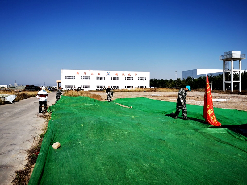 全體工作人員頂著烈日對黃土裸露區域進行覆蓋。大家分工明確,有條不紊,一邊清理廢棄垃圾,一邊小心謹慎的扯著防塵網布與迎面吹來的大風沙土博弈。大家不怕臟、不怕累,個個奮勇爭先。經過半天的辛苦勞動,就完成了近萬平方的露天黃土覆蓋工作。放眼望去,一片“綠草茵茵”,看似不可能完成的任務在大家的同心協力下順利完工,自豪和喜悅油然而生。