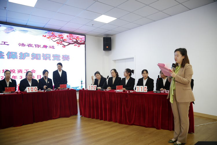3月8日,投資公司工會(huì)在環(huán)衛(wèi)運(yùn)營管理中以“情系女職工 法在你身邊”為主題,舉辦 “女職工權(quán)益保護(hù)”知識競賽。投資公司黨委書記、董事長、總經(jīng)理莊清付,黨委副書記、工會(huì)主席劉剛,副總經(jīng)理?xiàng)钍孛鳎鲉挝稽h政工、工會(huì)女工委成員、悅升機(jī)關(guān)全體員工觀摩比賽。