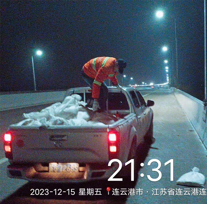 12月15日夜間21時(shí)左右,受寒潮影響,徐圩大地瞬間飄落鵝毛般雪花。為保障新城主要干道車輛、行人往來石化園區(qū)安全暢通經(jīng)過。保潔分公司結(jié)合徐圩城建與悅升公司冬季突發(fā)天氣處置預(yù)案,聞雪而動,第一時(shí)間啟動布放融雪劑工作,大橋兩側(cè)盡顯保潔人無懼嚴(yán)寒勞動場景。